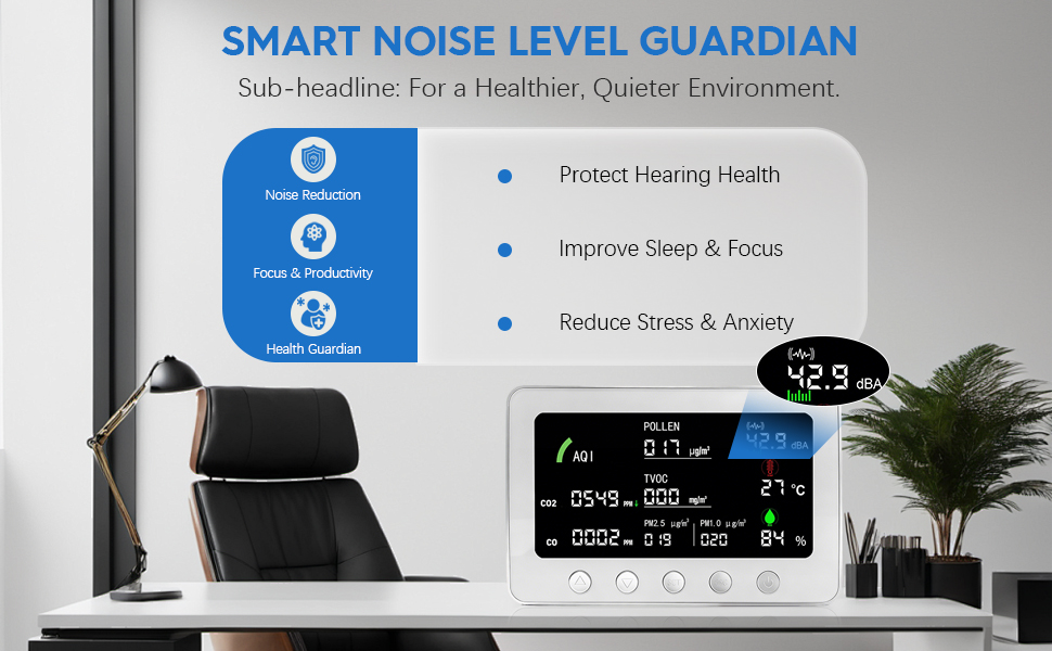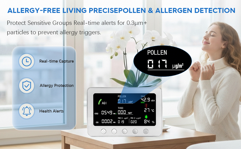 - 11-in-1 full-dimensional detection, covering core indicators such as AQI, CO₂, CO, PM2.5, Pollen, TVOC, Noise, Temp and RH.